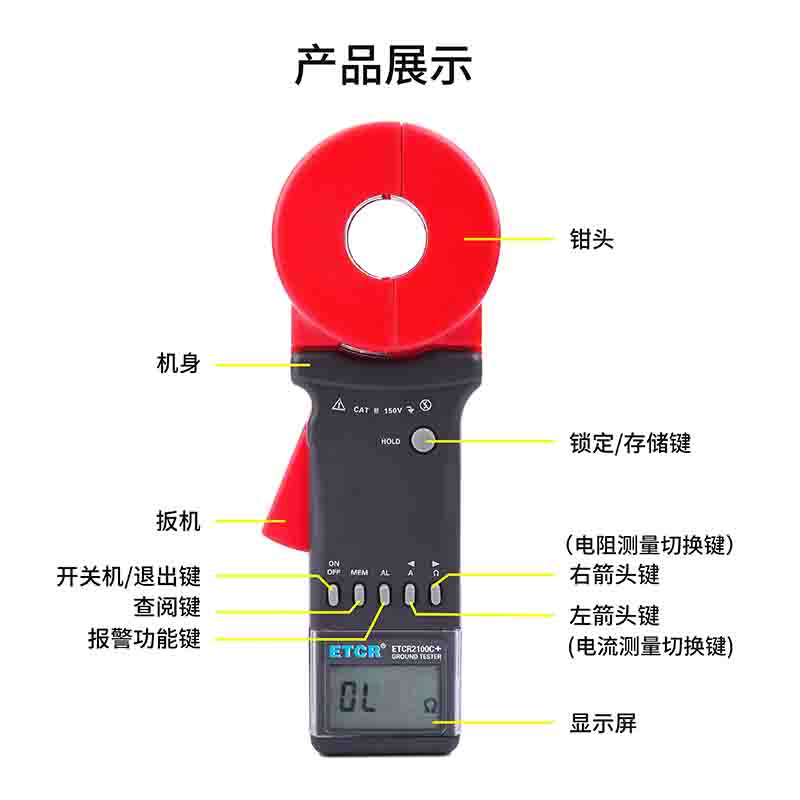 ETCR2100C+鉗形接地電阻儀又稱鉗形接地電阻表、接地電阻儀、回路電阻測試儀、單鉗接地電阻測試儀、環(huán)路電阻測試儀,用于接地電阻、回路電阻測量、接地電流測量、接地故障判斷。在測量有回路的接地系統(tǒng)時,不需斷開接地引下線,不需輔助接地極,安全快速、使用簡便。鉗形接地電阻儀廣泛應用于電力、電信、氣象、油田、建筑及工業(yè)電氣設備等的接地電阻測量、回路電阻測量。