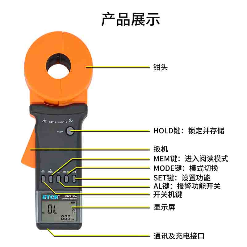 ETCR2150環(huán)路電阻測試儀電阻、電流、測試時間同屏顯示,測試結(jié)果一目了然。配備可充電鋰電池,使用方便。聲光報警功能,數(shù)據(jù)存儲、數(shù)據(jù)保持功能。時鐘功能,顯示當前測試時間。USB接口數(shù)據(jù)上傳功能。