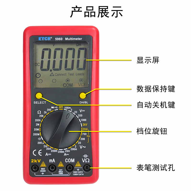 ETCR5960數(shù)字萬用表又稱數(shù)字萬能表、智能萬用表,是一種性能穩(wěn)定、用電池供電的高可靠性數(shù)字萬用表,它用單片機管理,全功能有過載保護。儀表能顯示各檔表筆和插座應插的位置,提示您不要插錯位置。該儀表能測量直流電壓和電流、交流真有效值電壓和電流、電阻、電容、二極管正向壓降、電路通斷等。測量準確、性能穩(wěn)定、安全可靠,是您理想的測試維修工具!