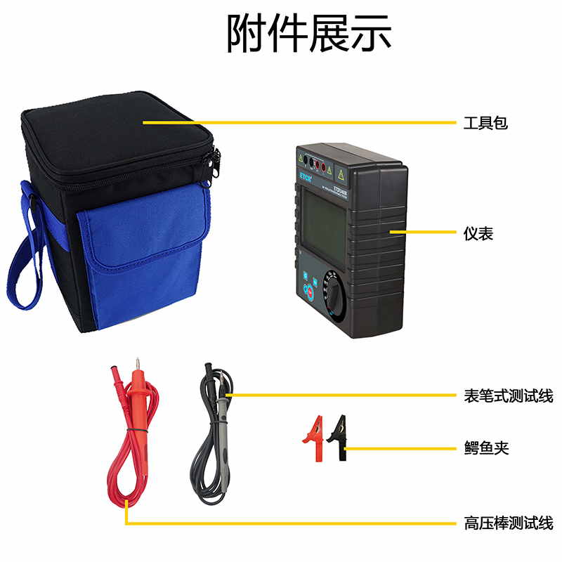 1、6檔輸出電壓50V、250V、500V、1000V、2500V、5000V,寬量程0.1MΩ~1000GΩ,最大短路電流2mA。