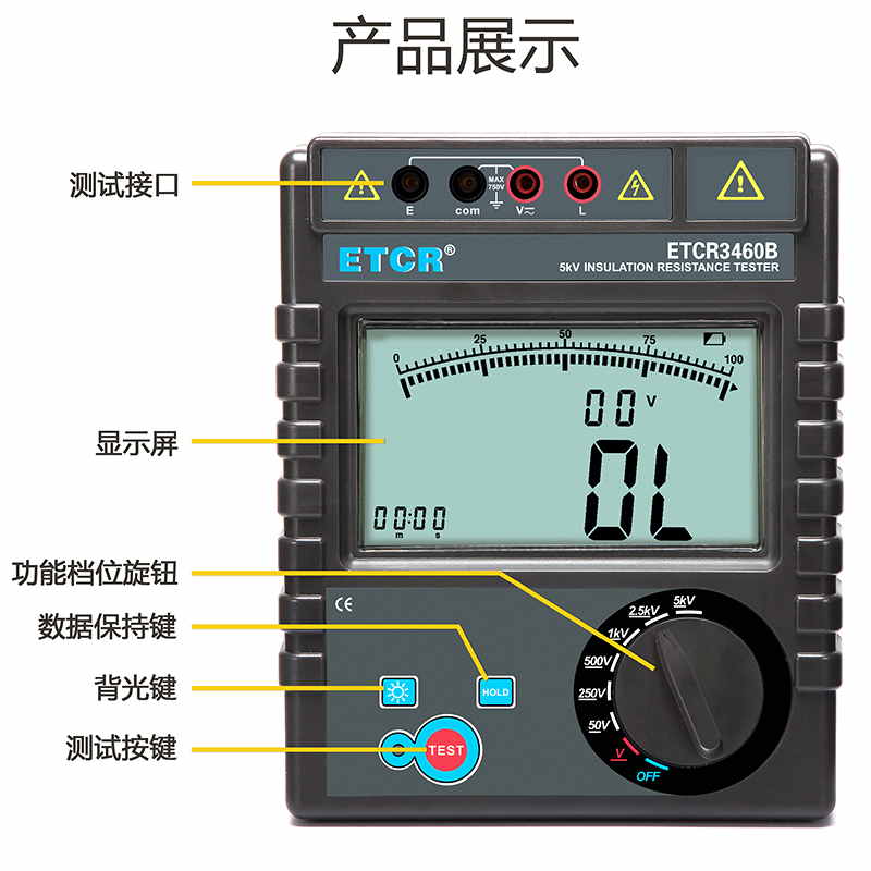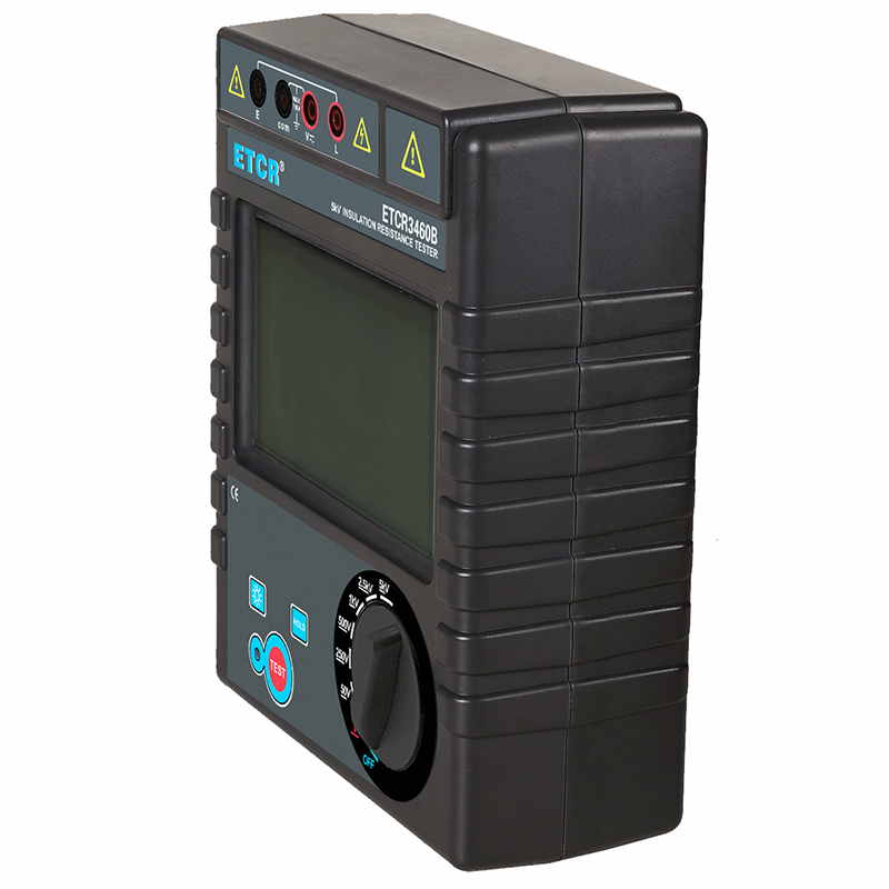 ETCR3460B絕緣電阻表又名兆歐表、絕緣電阻測試儀,用于絕緣電阻測試。儀表具有LCD大屏幕帶背光顯示、數(shù)據(jù)保持、自動放電、自動關(guān)機等功能。儀表具有測試計時,電壓監(jiān)測功能,回路電壓大于36V時,儀表將禁止測試以保護被測物及人員安全。儀表功能操作簡易,絕緣電阻值,測試時間,輸出電壓同屏顯示,具備交流電壓、直流電壓測試功能。