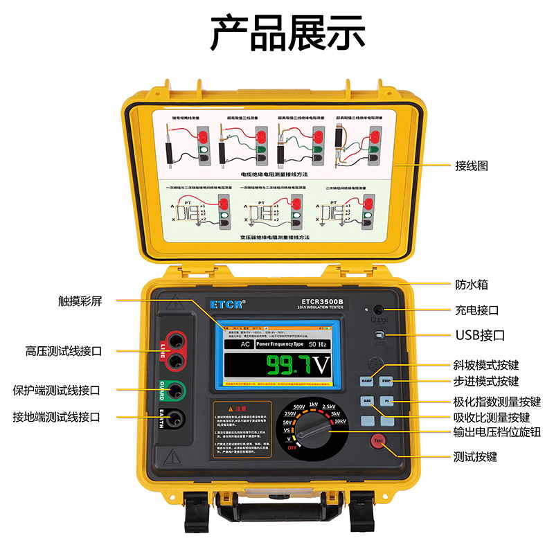 ETCR3500B高壓絕緣電阻測(cè)試儀又稱高壓兆歐表、高壓絕緣電阻表,擁有完善的各種絕緣電阻指標(biāo)測(cè)試功能、自設(shè)測(cè)試電壓功能、良好的抗干擾能力,在變電站等有強(qiáng)感應(yīng)電環(huán)境下、以及在分布電容較大的使用場(chǎng)景下具有明顯優(yōu)勢(shì)。儀表采用真彩觸摸屏,所有測(cè)試數(shù)據(jù)及電池電量同屏顯示一目了然,旋鈕開關(guān)和按鍵組合使得操作非常簡(jiǎn)單。用戶無(wú)需費(fèi)力記憶操作方法,點(diǎn)擊屏幕的“HELP”即可彈出操作方法,有效指引用戶操作儀表。產(chǎn)品適用于大容量、高壓、強(qiáng)感應(yīng)電環(huán)境下電氣設(shè)備、輸電線路等大型設(shè)備的絕緣電阻測(cè)試。是電力、電信、氣象、機(jī)房、油田、機(jī)電安裝和維修以及工礦企業(yè)供電部門常用而必不可少的儀表。