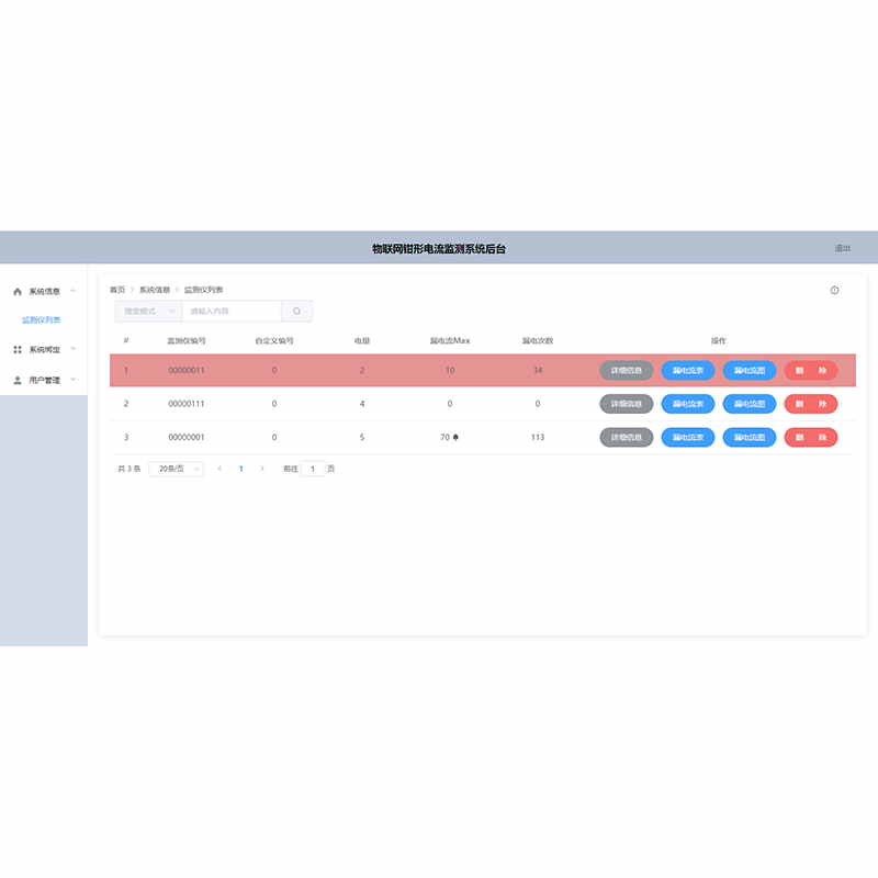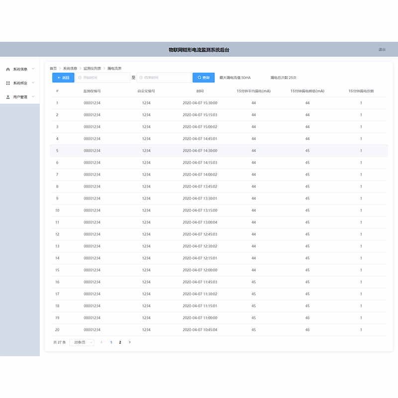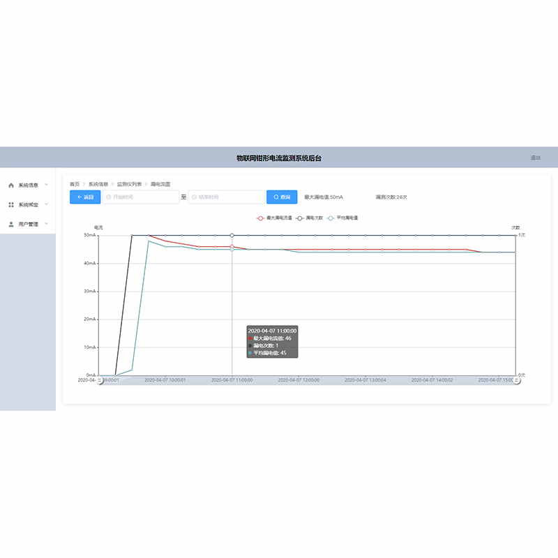 1、數(shù)據(jù)統(tǒng)計(jì)功能:系統(tǒng)對(duì)上傳數(shù)據(jù)進(jìn)行統(tǒng)計(jì),實(shí)現(xiàn)表格與折線圖兩種查看方式,實(shí)時(shí)監(jiān)測(cè)并顯示最大電流值與漏電次數(shù),便捷高效實(shí)用。在PC終端可通過時(shí)間按鍵快速查詢,該時(shí)間內(nèi)的所有監(jiān)測(cè)數(shù)據(jù)并以表格或折線圖兩種方式之一顯示出來。