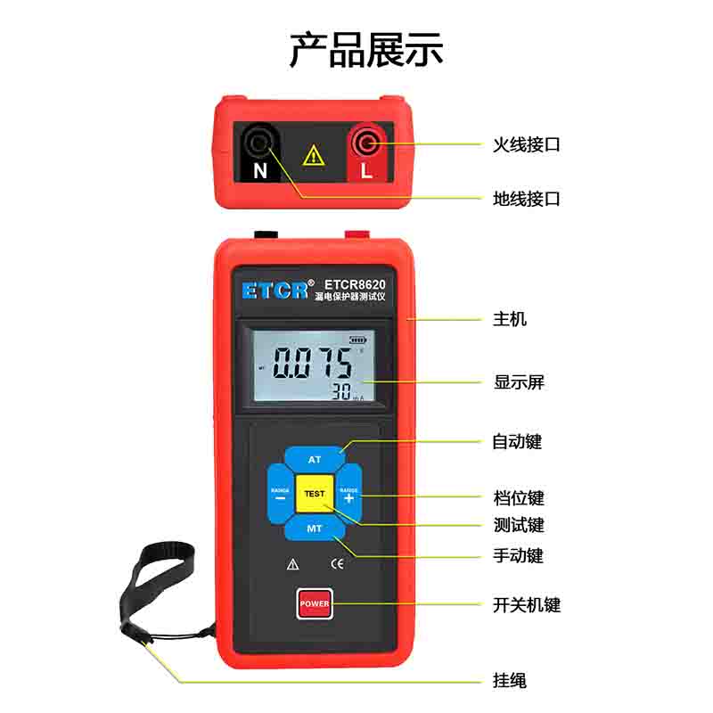 ETCR8620漏電保護器測試儀15mA~1000mA,十二檔0.001~1.000s--LCD屏干電池