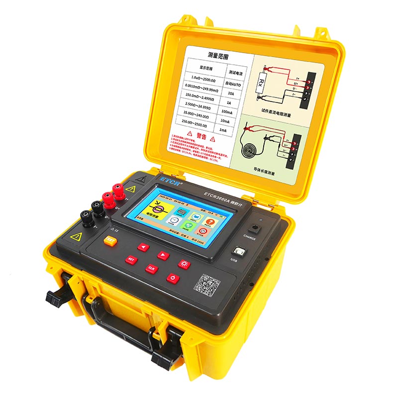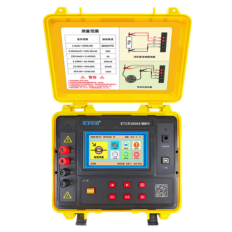 ETCR3660A微歐計又稱直流電阻測試儀、直流低值電阻測試儀,儀表采用微處理機技術,精密四線法測試,準確可靠。主要用于測量小型變壓器繞組電阻;接地導通電阻;電纜導線電阻;開關、接插件、繼電器的接觸電阻;金屬鉚接電阻;線圈、電動機、互感器繞組電阻;金屬構件之間聯(lián)結電阻;電焊接點電阻;蓄電池并聯(lián)連接電阻;以及導線長度測量計算等。儀表外殼采用防水保護箱,防撞、防摔、防水(防護等級IP65)堅固安全耐用,儀表還配有大容量可充電鋰電池組,特別適合在戶外工地使用。廣泛應用于建筑質檢站、監(jiān)理公司、建筑施工單位、防雷公司、電力部門、船舶機車廠等。
