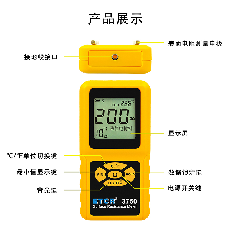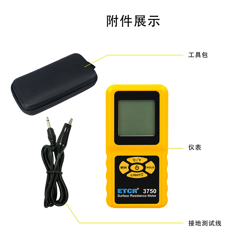 ETCR3750表面電阻測(cè)試儀是一款具有高量程的表面電阻測(cè)試儀,電阻測(cè)量范圍為:103Ω~1012Ω。本產(chǎn)品使用方便,即可以用來測(cè)試物體表面的電阻值之外還可以測(cè)量物體的對(duì)地電阻阻值,同時(shí)還能顯示當(dāng)前所處環(huán)境溫度。測(cè)量物體表面電阻時(shí)需將背面的兩根平行金屬條緊貼物體表面,待數(shù)據(jù)穩(wěn)定后,即可直接從LCD顯示屏上觀測(cè)阻值大小,判斷物體是屬于導(dǎo)體材料、防靜電材料或者是絕緣體材料,儀器適合于各種防靜電領(lǐng)域。