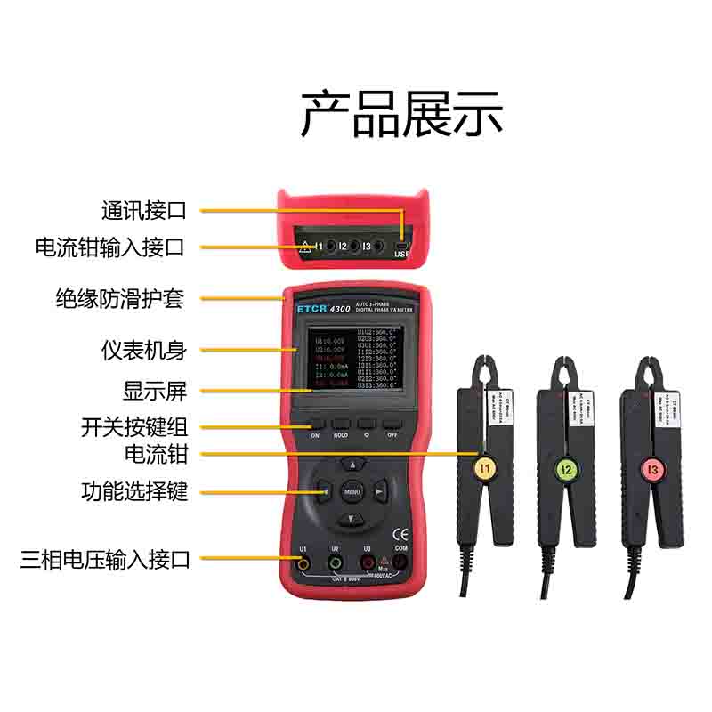 ETCR4300三相數(shù)字相位伏安表又稱三鉗相位伏安表、三相相位伏安測試儀、手持式相位測試儀、便攜式相位表 、矢量圖分析儀,用于同時測量三相交流電壓、電流、電壓間相位、電流間相位、電壓電流間相位、頻率、相序、有功功率、無功功率、視在功率、功率因數(shù)、電流矢量和,判別變壓器接線組別、感性、容性電路,測試二次回路和母差保護(hù)系統(tǒng),讀出差動保護(hù)各組CT之間的相位關(guān)系,檢查電度表的接線正確與否,檢修線路設(shè)備等,為用電檢查人員提供一種安全、準(zhǔn)確、便捷的新型電力儀表。尤其適用于電能計費系統(tǒng)及繼電保護(hù)系統(tǒng)。