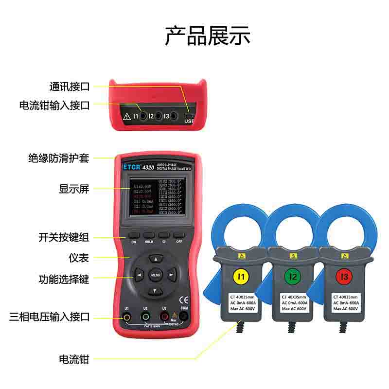 ETCR4320大口徑三相數(shù)字相位伏安表又稱三鉗相位伏安表、三相相位伏安測(cè)試儀、手持式相位測(cè)試儀、便攜式相位表 、矢量圖分析儀,用于同時(shí)測(cè)量三相交流電壓、電流、電壓間相位、電流間相位、電壓電流間相位、頻率、相序、有功功率、無(wú)功功率、視在功率、功率因數(shù)、電流矢量和,判別變壓器接線組別、感性、容性電路,測(cè)試二次回路和母差保護(hù)系統(tǒng),讀出差動(dòng)保護(hù)各組CT之間的相位關(guān)系,檢查電度表的接線正確與否,檢修線路設(shè)備等,為用電檢查人員提供一種安全、準(zhǔn)確、便捷的新型電力儀表。尤其適用于電能計(jì)費(fèi)系統(tǒng)及繼電保護(hù)系統(tǒng)。