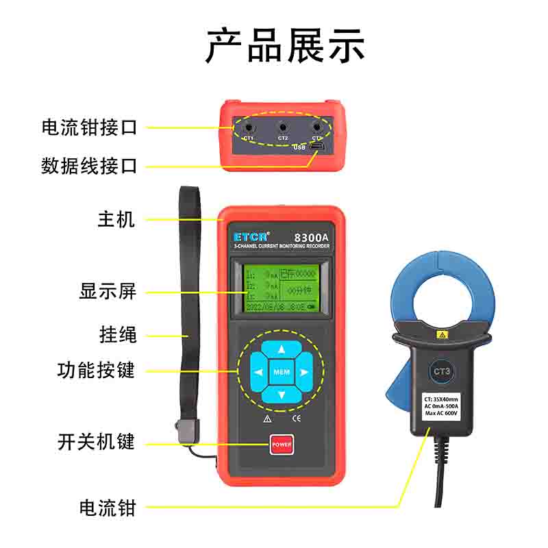 | ETCR8300A三路鉗形電流記錄儀 | 35mm×40mm | AC 0mA~500A | 7天 | 1秒-99分鐘 | 20萬(wàn)組 | 鋰電池 | 有 |