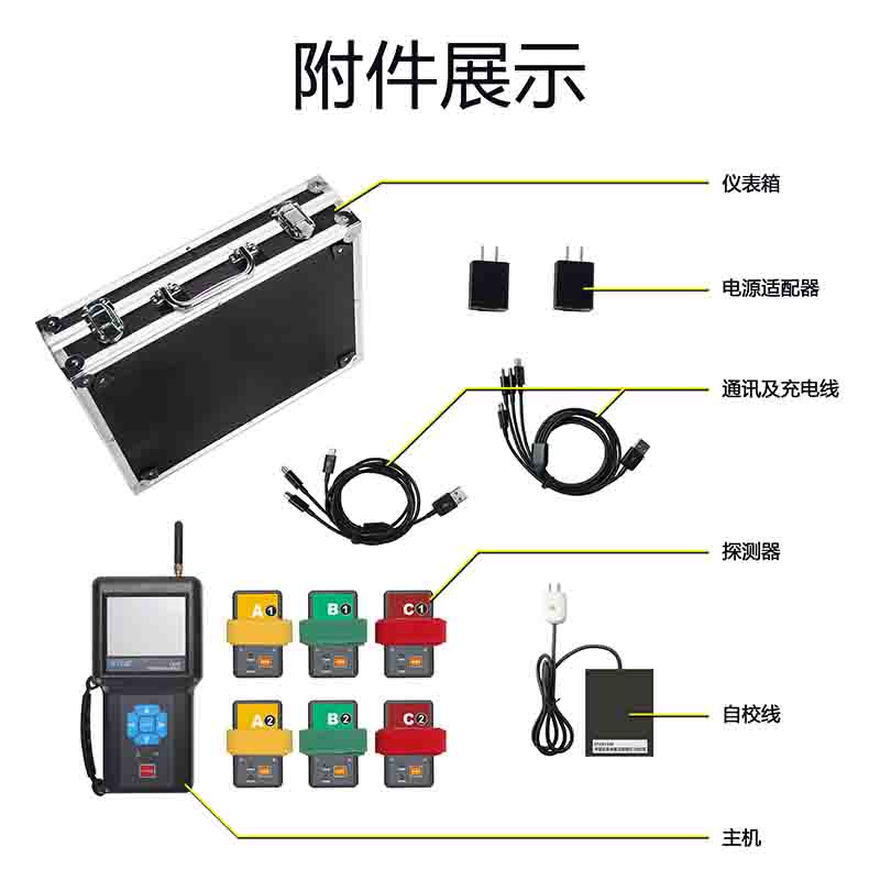 儀表質(zhì)量 | 主機:約380g(含電池);探測器:約71g×6個(含電池);總質(zhì)量:約2.57kg(含附件) |