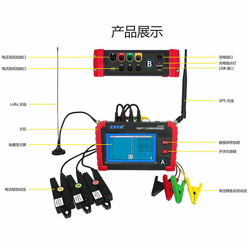 ETCR4500無線PT壓降負荷測試儀又稱PT核相儀、PT負荷測試儀、PT比差測試儀,用于現(xiàn)場在線測試電能計量裝置電壓互感器(以下簡稱 PT)的二次回路壓降,以及PT核相、PT負荷測試、CT負荷測試、三相伏安表、諧波分析等。儀表由2臺手持終端、6個電流鉗、2組電壓測試線等組成,2臺手持終端具有無線通訊及GPS通訊,可互設(shè)為主機或從機,實現(xiàn)同步測量變電站內(nèi)不同位置之間電流、電壓、相位等參數(shù)。